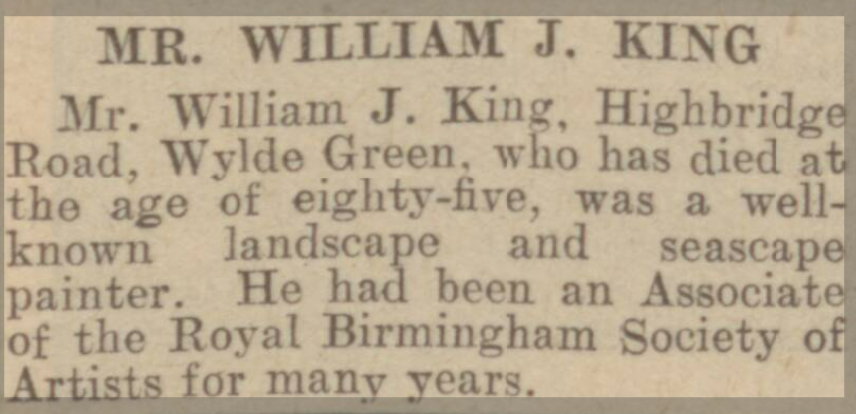Mr King is just now holding a special exhibition of his works in his studio at Highbridge Road, Wylde Green, and the exhibition, which is thoroughly representative, is well worth inspection by all who are interested in local art. An additional element of interest is added by the participation of Mrs King, who has made a speciality of miniature landscapes, which she paints with delightful daintiness and skill. [...] In No 5, “New Hall Mill,” the artist has given a faithful rendering of a local subject which will appeal to all who are familiar with the locality. [...]