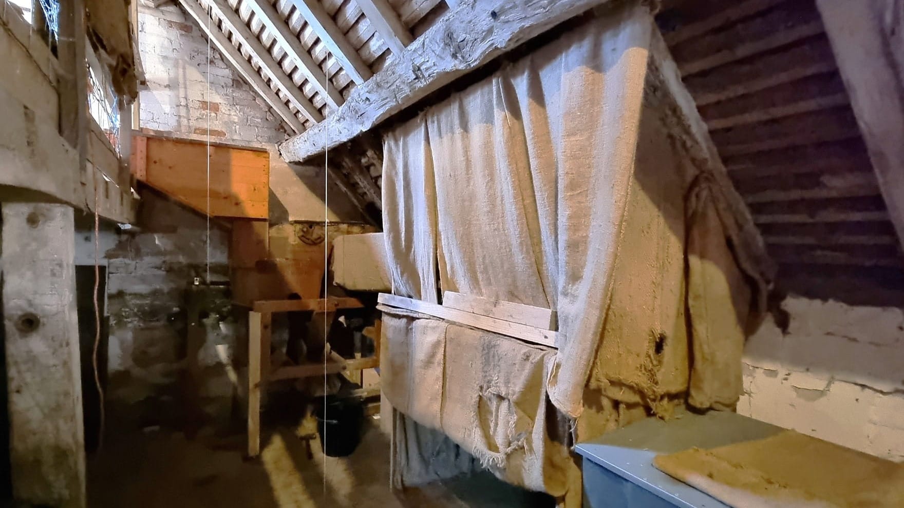 The 'stives', consisting of the chaff and any other light rubbish, are sucked away from the grain as it falls through the machine. Some are retained in a central waste section of the machine but the lightweight chaff passes through the fan and is collected in the 'stive room', the large separate area enclosed by sacking, from which it is later cleared. These days virtually nothing is collected behind the sacking, because the grain is already clean when it arrives at the mill.