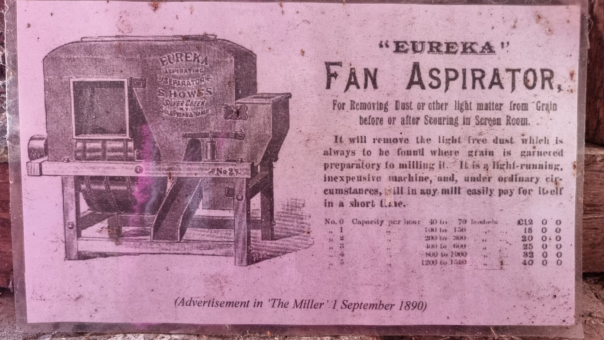 Our Aspirator was made in America in about 1905 by S. Howes of Silver Creek, New York. It was imported to England and installed in Rock Mill at Leamington Spa, near Warwick. After closure of the mill, it was transferred to New Hall Mill and located in one corner of the garner.