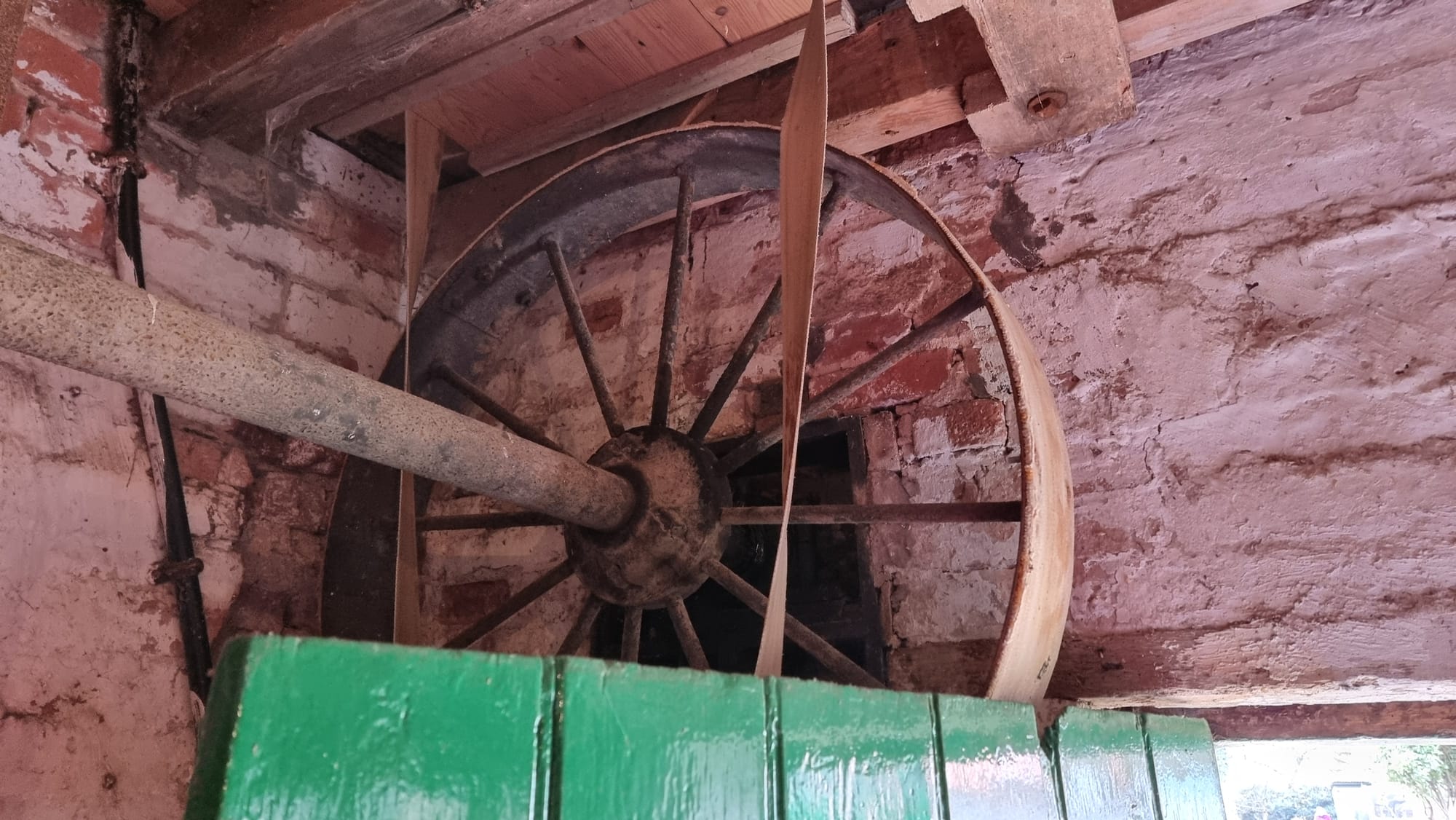 The Aspirator is powered via a line shaft, pulleys and a canvas belt from the ground floor and, apart from the millstones, it is the only machine to be powered by the waterwheel. The belt on the right of the machine drives a large internal fan to produce a strong updraft of air through the machine. The belt extends down to a gear on a drive shaft on the ground floor over the entrance door.