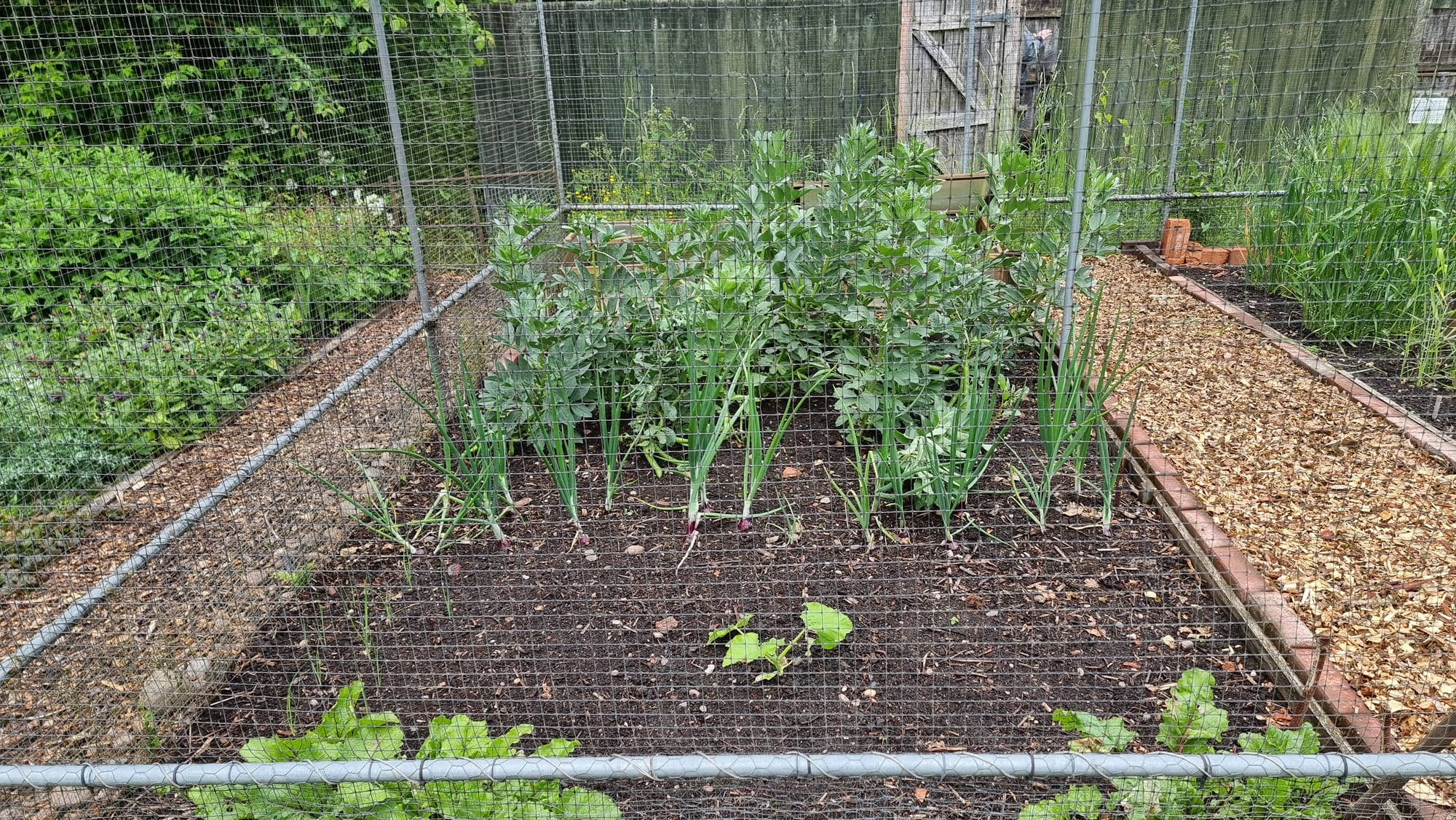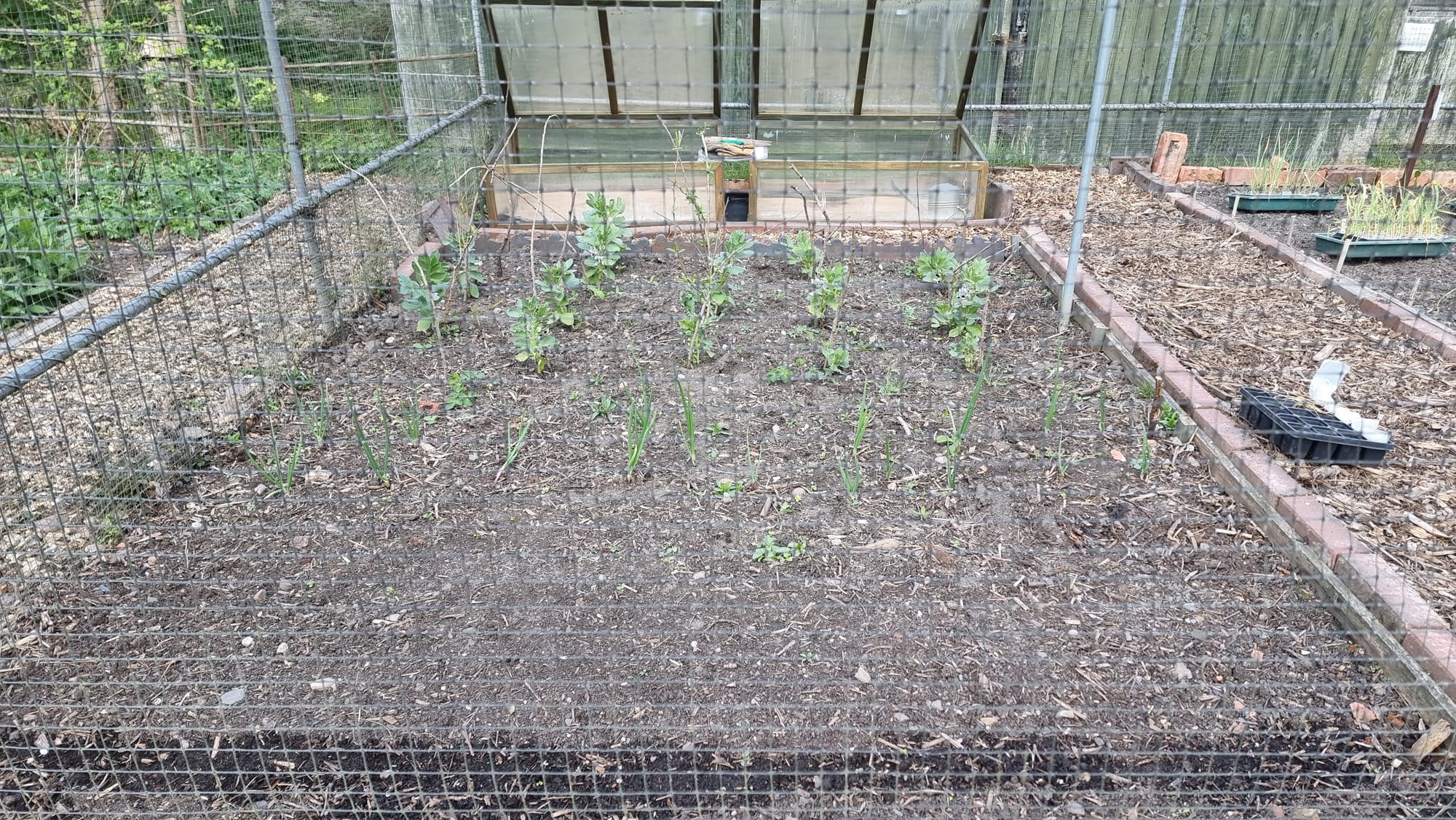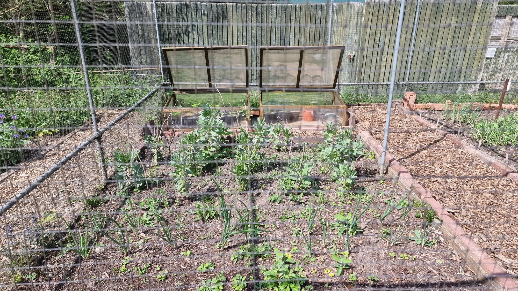 In 2025 we are growing broad beans, red onions, shallots, and two rows of beetroot (from back to front).