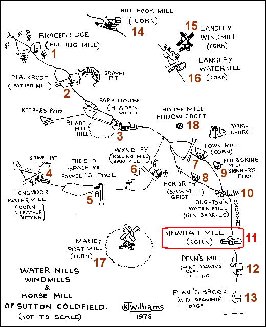 New Hall Mill, downstream of Sutton Park and Sutton Coldfield, originally abstracted water from the Ebrook, often referred to as Plant's Brook, via a 'leat' or man-made channel that fed into the mill pond. Based on extensive research by Ken Williams into the lost mills of the area, the Map of the Mills of Sutton Coldfield shown below, dated 1978, shows how the water could have been used many times by mills upstream before it was abstracted at New Hall Mill.