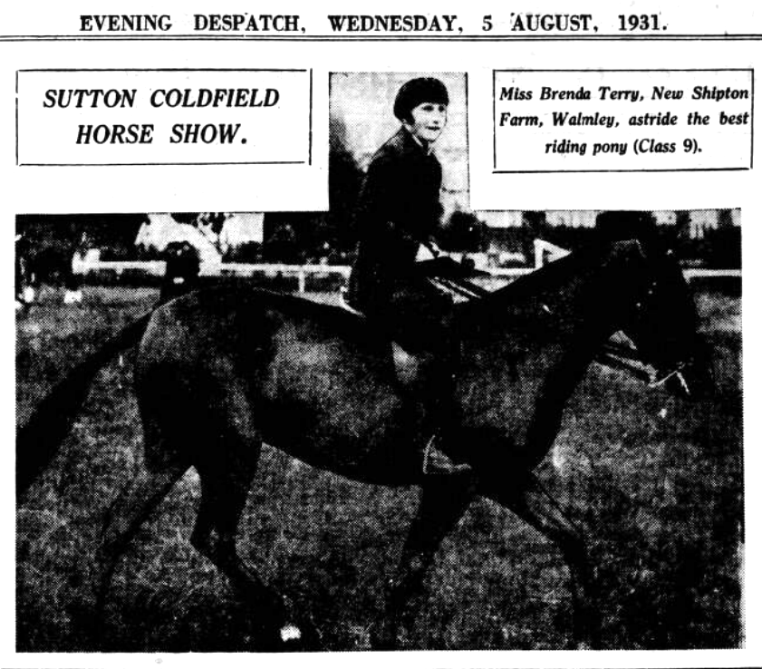 Arthur John Terry was living at nearby Langley Heath Farm when he married Laura Mary Barber in 1905. Their first marital home was Berwood Farm, Chester Road, Erdington. From at least 1911, the Terry family were living at New Shipton Farm. They had seven children: Alice Laura, Dorothy Gladys, Norman Arthur (their only son), Madge, Winifred (who died as a baby), Brenda Eileen, and Kathleen Margaret. Their eldest daughter Alice married Frank Joseph Phelps Eagles in 1928 and moved to Berwood Farm, but the rest of the family remained together at New Shipton. It was an horsey family. Arthur was a judge and organiser of Horse Shows, and Madge, Brenda, and Kathleen were keen riders.