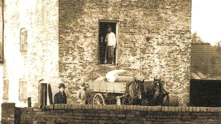 The doorway at the end of the Stone Floor is where sacks of grain were unloaded into the mill and where sacks of meal left the mill. In this photo believed to be from 1904, you can see the miller Benjamin Styles and a child standing in the original doorway, with a loaded cart below it.