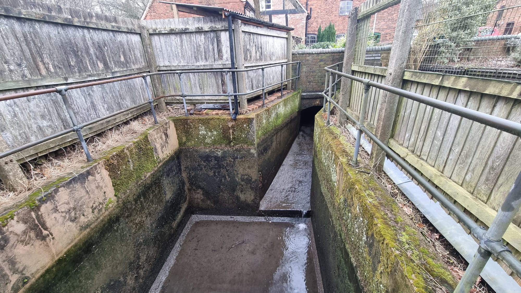 The water supply to New Hall Mill's millpond has been limited since about 1970, when the brook which previously filled the pond was diverted. The mill now uses a recirculation system to keep the water supply steady on Open Days. Water from the waterwheel is collected in a concrete tank located in the original tailrace, (often frequented by wildlife, including ducks and sticklebacks!) This water is then pumped back up into the mill pond through a pipe. This survey was carried out in 2018 – so let's go down under the mill yard and take a look!