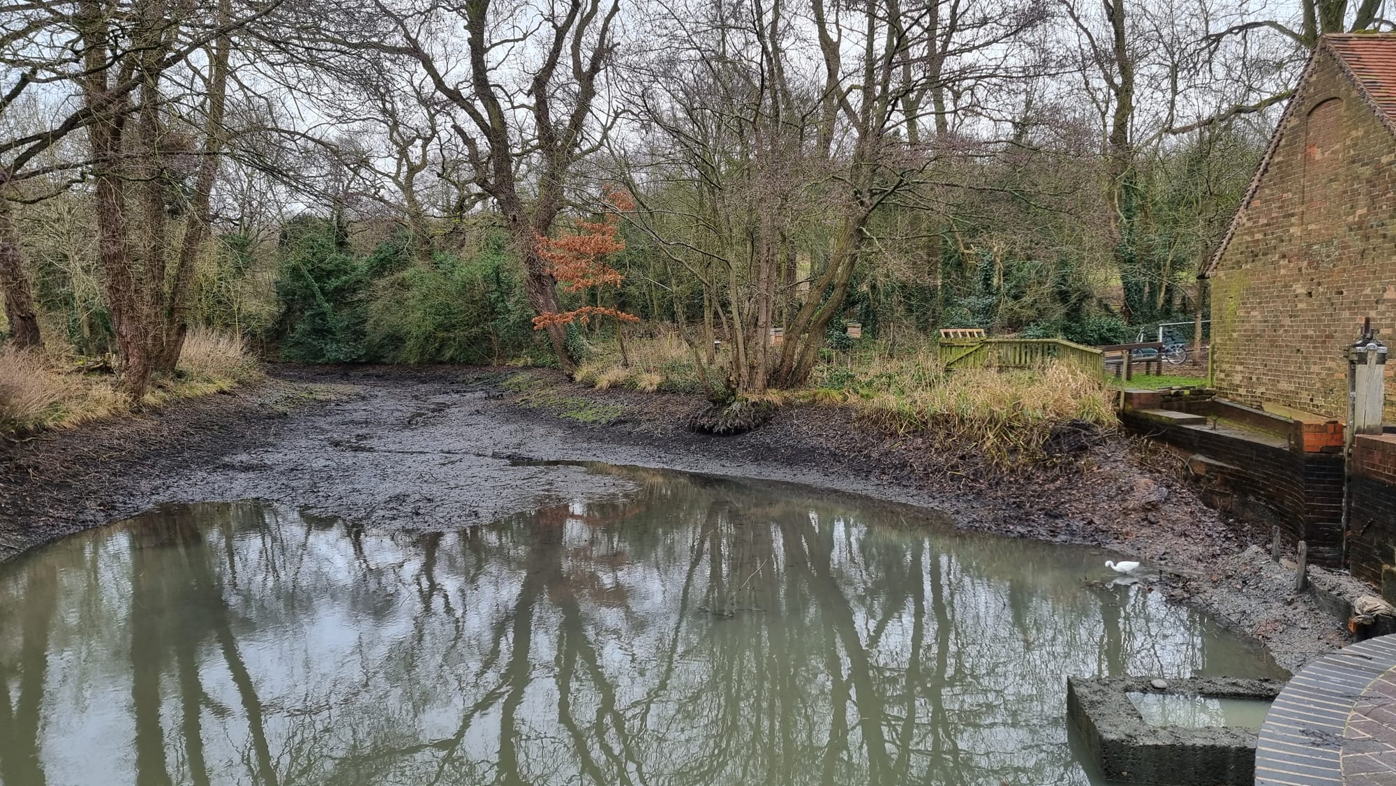You can see the Mill Pond at low water in the photo above. The water at the mill end of the pond is retained by outer layers of walling, from old limestone rubble to modern blocks and bricks. Within that wall, there is an inner barrier consisting of a wooden palisade fence against which there is a bank of puddle clay. You can see the palisade to the right of our resident egret in the picture above.