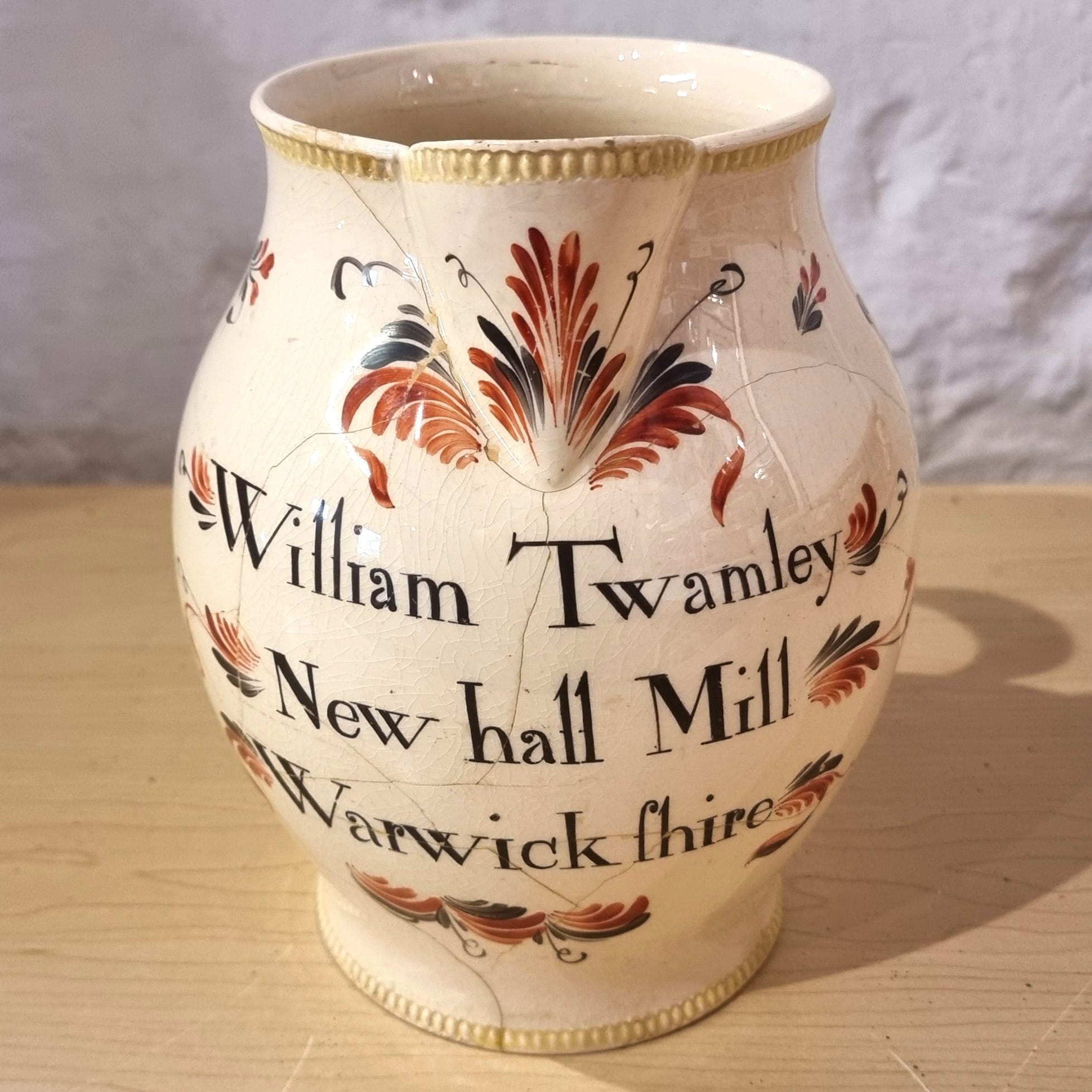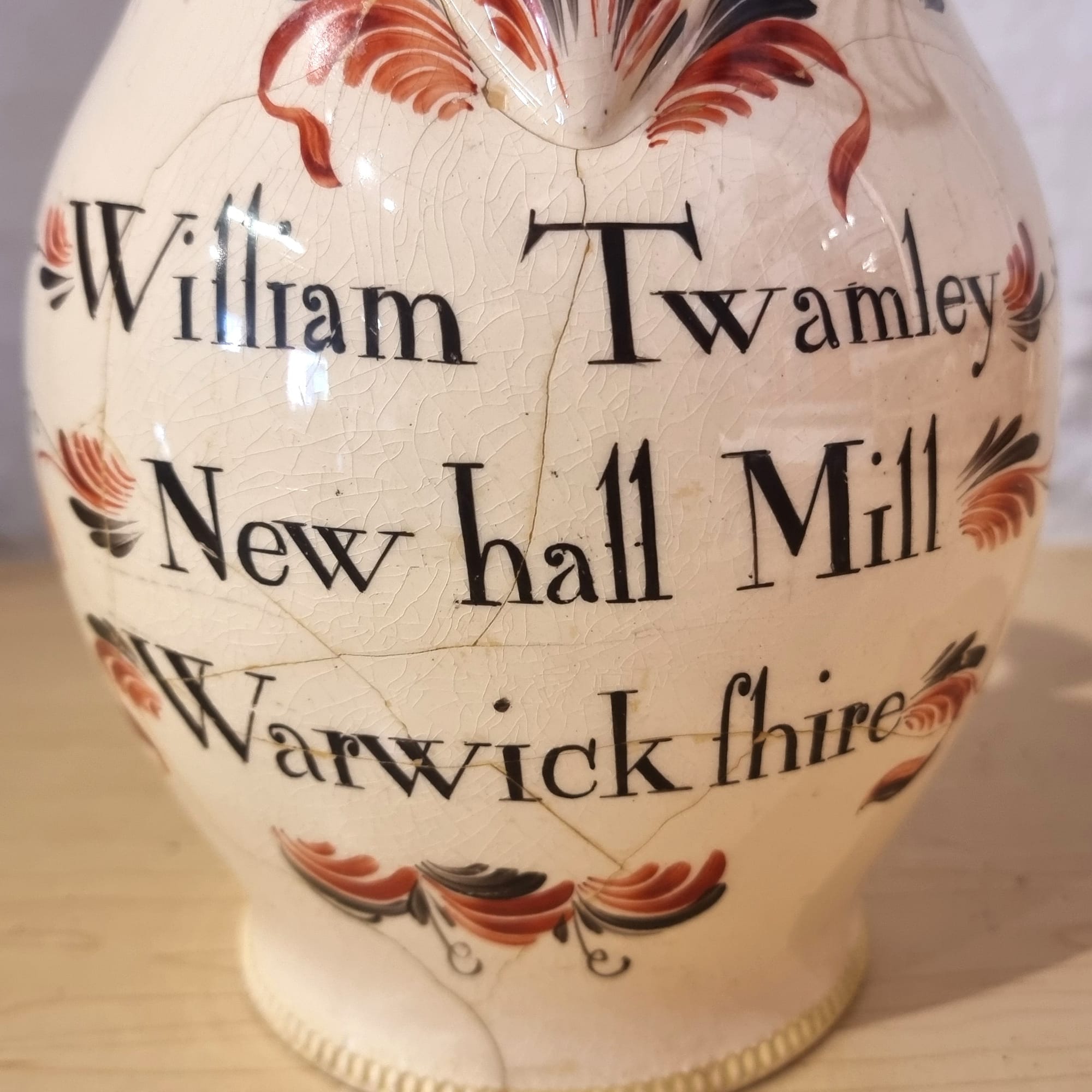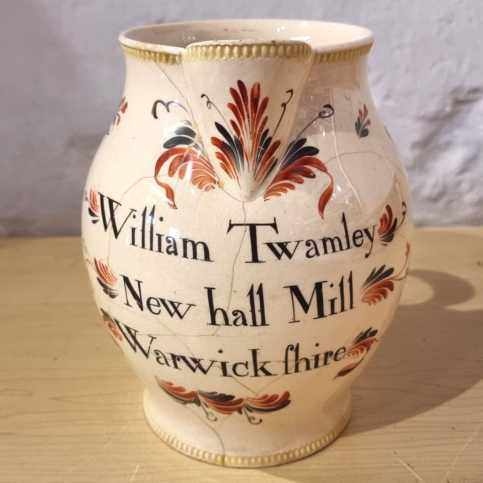 "The jug carries no maker's mark, unless it was on the missing bit, but the suggested date of later eighteenth century seems quite likely. Of course, the miller's name should provide a good indication of its date but, unfortunately, there seems to have been a William Twamley at New Hall Mill from the 1740s right through to the 1830s. A day in Warwickshire Archives looking at Sutton Coldfield parish registers showed there had certainly been four different William Twamleys at the mill during that period as the tenancy passed from father to son.