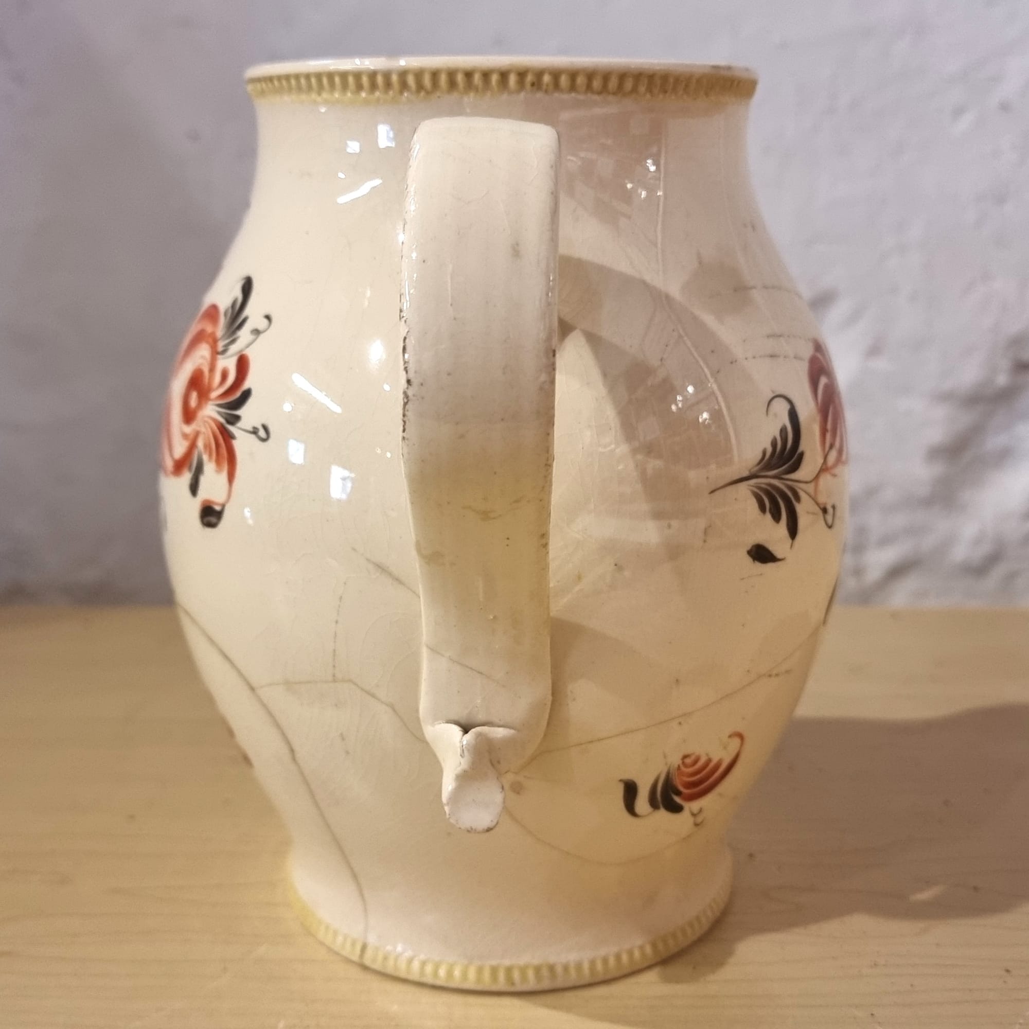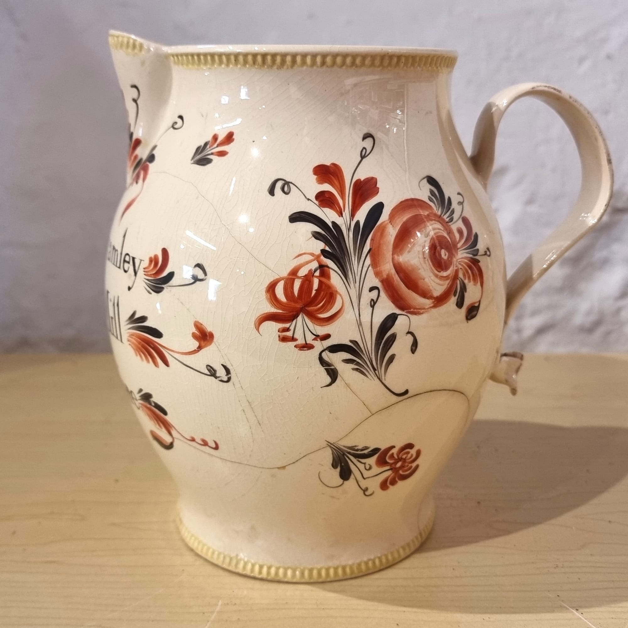 You can see this wonderful creamware jug on display at the mill on Open Days. It was probably made in Staffordshire, or perhaps in Yorkshire, between 1763 and 1779. It is decorated with iron red and black scrolled cartouches, roses, and lilies, and the top and bottom borders are beaded (gadrooned) and picked out in pale green.